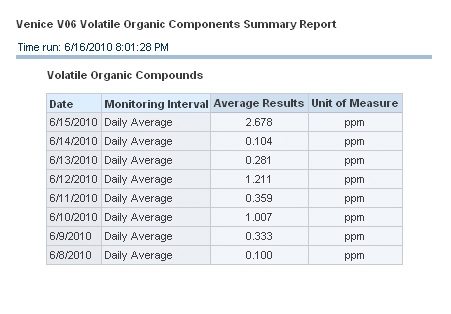Wow. The chemicals now in the gulf air have terrible consequences if inhaled. I am only going over the data from the EPA monitoring areas near New Orleans, namely: Chalmette, Grand Isle, and Venice. These areas have multiple stations that are numbered. The data given is in the form of PPM, or parts per million. To convert to PPB, or parts per billion, simply move the decimal over 3 places to the right. For example, if a measurement reading it 0.100 PPM, it is 100 PPB. The way to think about this is for every 1 Million particles, there are X particles of the VOC or SVOC.